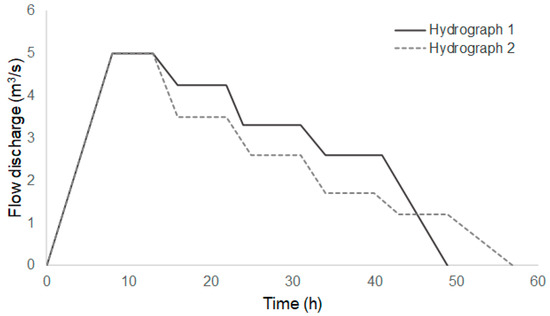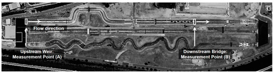 The water level data were collected in two rounds using ultrasonic sensors at a large-scale outdoor flume at the Korea Institute of Civil Engineering and Building Technology—River Experiment Center (KICT-REC) (Figure 1). The stream-scale channel’s length was 594 m, and the channel’s width was 11 m. The stream bed slope of the downstream section, which was the downstream water level measurement point, was approximately 3/1000. The generated flow in the channel could be controlled by adjusting the flow supply pump equipment. As shown in Figure 2, unsteady flow experiments with two different forms of flow discharge hydrographs were designed. While the maximum discharge of the two hydrographs was designed with the same at 5 m3/s, the total durations of the flow events were different. Two ultrasonic sensors were installed at the upstream weir of measurement point (A) and at the downstream bridge of measurement point (B) in the channel to monitor water levels when two different hydrographs were generated one after another (Figure 1). Therefore, a total of four data sets of ultrasonic sensors were collected for this study: two data sets at measurement points (A) and (B) for hydrograph 1 and two data sets at measurement points (A) and (B) for hydrograph 2. By converting the water level measured at the upstream weir of measurement point (A) to flow discharge using the previously developed relation between water level and flow discharge, changes in the flow discharge from the upstream to the channel can be tracked over time. The flow rate over a weir is a function of the head on the weir. Therefore, the flow rate measurement in a rectangular weir is based on the Bernoulli Equation principles. The discharge coefficient for a rectangular wide weir used in the experiment was determined and calibrated prior the experiments to present the rectangular wide weir equation for flow. Water level measurements at the downstream bridge of measurement point (B) observe the water level changes in the downstream section of the experimental channel.