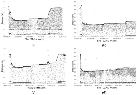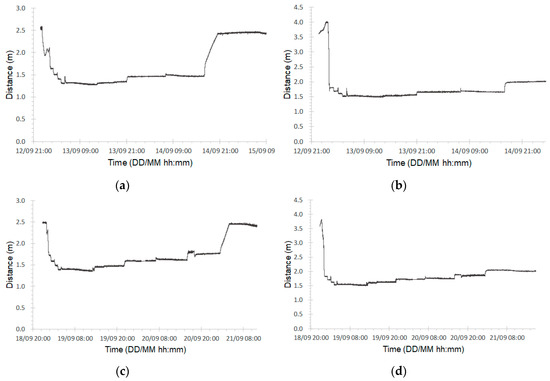 Measured raw data of the distance from the ultrasonic sensor to water surface for about 60 h. (a) Case of hydrograph 1—downstream bridge; (b) case of hydrograph 1—upstream weir; (c) case of hydrograph 2—downstream bridge; (d) case of hydrograph 2—upstream weir.