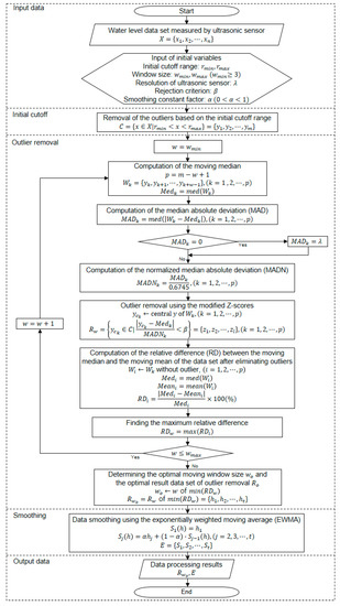 In the water level data set that was collected by the ultrasonic sensors in this study, there were many outliers with relatively large deviations distributed in the set and a relatively large random error due to the occurrence of water waves. Considering these data characteristics, the data processing algorithm developed in this study was broadly divided into an outlier removal process and a smoothing process. The algorithm incorporated an initial cutoff stage that set the initial cutoff range and determined that data outside this interval were outliers, removing them en masse. This process detected over 70% of all outliers in the water level data set captured by ultrasonic sensors. The outlier removal process after the initial cutoff used modified Z-scores based on the median and MAD. The outlier removal stage included a process for determining the optimal window size for setting the moving median and MAD. To address cases when the MAD was zero, such as when the same value was distributed above a specific ratio in the data set for the given window size, the proposed algorithm defined the ultrasonic sensors’ resolution as the MAD value. EWMA was then used in the data smoothing process, which allowed different levels of smoothing results to be calculated according to the data processing goals by entering various values for the smoothing constant factor .