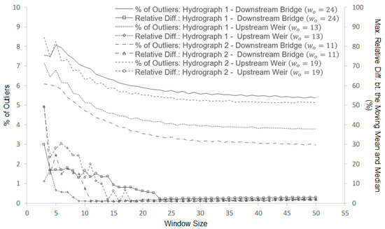 After the initial cutoff stage, the outlier removal process was completed using modified Z-scores. This stage calculated the sample median and MAD of each data point in the dataset that passed through the initial cutoff, and then calculated the corresponding modified Z-scores, which were dimensionless values. When this value exceeded the user-entered , the corresponding data point was determined to be an outlier and removed. In this step, when the median and MAD were estimated, a moving window was applied to consider that the water level data changed over time, and therefore, the optimal window size () had to be determined. The algorithm proposed here calculated the relative difference in the moving median and the moving mean, as measures of the data set’s central tendency with outliers removed, for each window size . The that had the smallest maximum relative difference was determined to be . In order to determine ’s calculation range, input for and were needed. If the number of samples was two, the median and mean calculation results were the same. Therefore, the minimum window size had to be more than three. When the algorithm is applied to real-time monitoring system, the optimal window size cannot be determined in real time. In this case, fixed window size should be applied or optimal window size could be updated based on the previous results of data processing with a certain period of time.