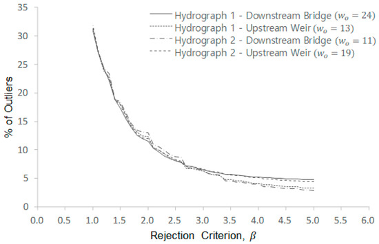 In addition to the window size setting, this study also analyzed the degree of outlier detection according to changes in the rejection criterion that the user must enter as an input value in the outlier stage using modified Z-scores. While the value of 3.5 that was proposed by Iglewicz and Hoaglin [26] is commonly used, a sensitivity analysis for the rejection criterion is required to ensure that the value of 3.5 is appropriate for outlier detection of water level data measured by ultrasonic sensors. In this study, was increased from 1 to 5 in units of 0.1, and the corresponding ratios of removed outliers were calculated; the results are shown in Figure 7. For the window size used to calculate the moving median and MAD, the optimal window size found when was set at 3.5 was used. As shown in Figure 7, when increased, the ratio of removed data decreased exponentially, and when exceeded the range from 3.0 to 3.5, the percentage reduction in removed outliers was greatly reduced. Table 2 shows the ratios of removed outliers when different rejection criteria were applied to the four data sets.