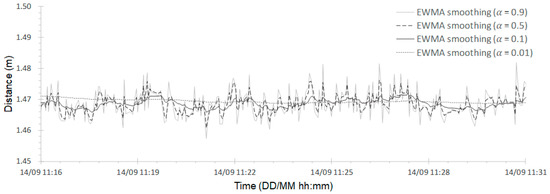 Even if the outliers that occur in the measured water level data are entirely removed, there is approximately 2 cm of dispersion that occurs due to water waves in the flowing water. If a constant water level is repeatedly measured under the same conditions at short intervals using an ultrasonic sensor, a normal distribution is formed by the observed values due to random error, excluding outliers. Therefore, a moving average can be applied as a smoothing method. This is the simplest form of a low-pass filter that is commonly used in signal processing to smooth short-term variations in time series data. However, the actual water level can change over time during the monitoring period. Therefore the most recently observed data must be reflected more than older data in the smoothing process, and the EWMA can be used for such cases to apply lower weights to older data [29]. The EWMA exponentially reduces the weighting factors of older data as shown in Equation (4), when the data set is listed as a sequence for time [29]: