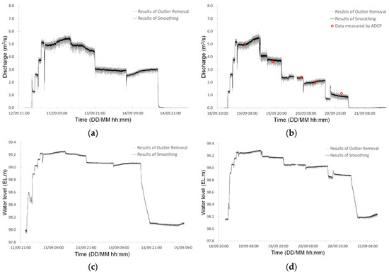 The data set after the smoothing process using EWMA. (a) Case of hydrograph 1—downstream bridge; (b) case of hydrograph 1—upstream weir; (c) case of hydrograph 2—downstream bridge; (d) case of hydrograph 2—upstream weir.