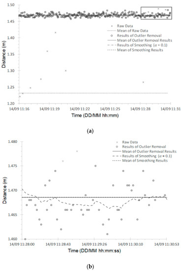Figure 10a,b show the very large difference in the degree of dispersion in the data that had undergone outlier removal and the data that had undergone the smoothing process. Furthermore, when the flow was large, this difference was even larger. In order to compare the data processing results by stage, Figure 11 shows the interval data from 14/09 11:16 to 14/09 11:31 in the hydrograph 1—downstream bridge data set, which included the data on the distance from the ultrasonic sensor to the water surface that had not been converted to water level data. The average values of the outlier removal and smoothing results for this interval were almost the same at 1.46855 m and 1.46860 m, respectively. However, the average value for raw data without data processing was 1.232 m, demonstrating the difference due to unremoved outliers.