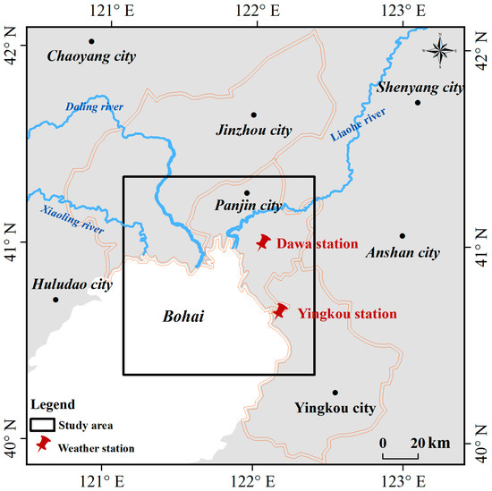 The meteorological data used in this study were retrieved from fixed stations located in Dawa County and Yingkou City (Figure 1). The meteorological data included solar radiation, wind speed, air temperature, relative humidity, and evaporation, and were obtained from the National Climate Center, China Meteorological Administration (http://data.cma.cn). These datasets were available and were processed with quality control. Inverse distance weighted interpolation using the ArcGIS 10.2 extension tool was applied in the study area to obtain a good spatial representation of the meteorological inputs [30].