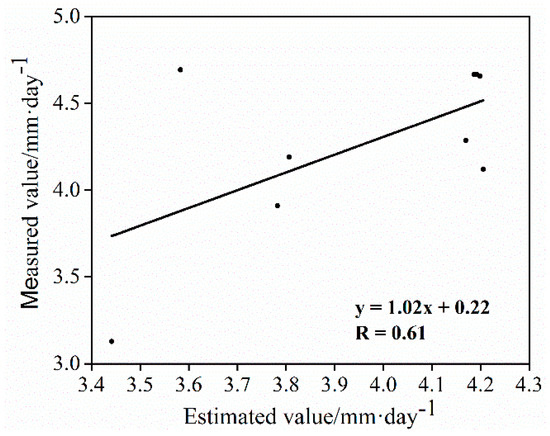 The results showed a reasonable correlation between the measured and estimated values of ET (R = 0.61, sig < 0.05; Figure 3) with a mean relative error of 9.01%, which indicates that the estimated values were reliable.