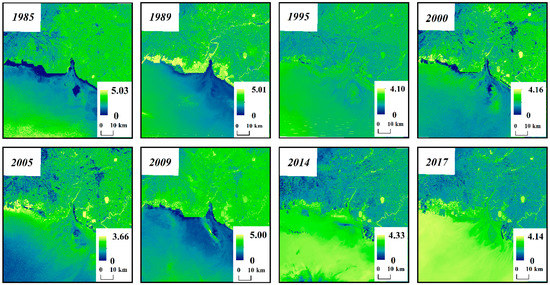The results in Figure 5 demonstrate the spatial variations of ET in the study area during the growing season from 1985 to 2017, with a gap of nearly five years. The results precisely demonstrated that ET varied significantly in space and over time. The results also confirmed that the water body had the highest ET estimates for the entire period, compared with other areas. By contrast, the area of land–water junction had the lowest ET during the entire period. In addition, higher values of ET were observed in the eastern, southern, and middle sections of the study area, whereas the western section showed a lower ET. This spatial pattern was due to the ET, which was closely related to land uses/cover types in the region to some extent (Figure 2). The reasons might be attributed to the following: (i) higher ET estimates experienced in the southern section of the region were, to some extent, linked to the water surface evaporation; (ii) the results, showing the higher values in the eastern and middle sections of the region, might be due to the large area of paddy and reed fields, and might result from the combined effects of water surface evaporation and vegetation transpiration; (iii) the land cover map showed that tidal flat, bare land, and sand range were located in the area of the water–land junction, which might result in lower ET because of low vegetation coverage, regardless of the effect of Bohai Sea. The heterogeneous spatial distribution of ET may be an indication that different land cover types exhibited different ET signatures.