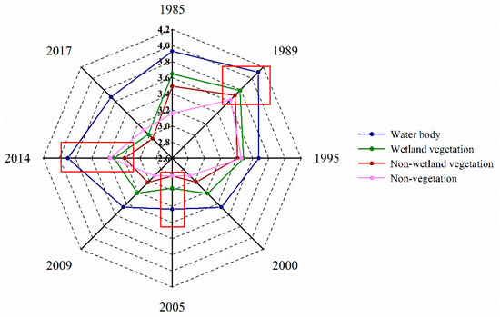 Figure 7 shows the statistics of four various dominant land cover zones extracted from the mean ET map, based on an overlay of land use/cover map. From the figure, the temporal change of ET for four land cover zones included water body, wetland vegetation, non-wetland vegetation, and non-vegetation. The inflection points of various land cover zones in 1989, 2005, and 2014 were consistent with the interannual variation and trend of ET, as shown in Figure 5. The result also confirmed that water body had the highest ET estimates during the entire period, whereas non-vegetation had the lowest ET estimates in most years. Although lower water and vegetation coverage was shown in non-vegetation areas than in non-wetland vegetation and wetland vegetation areas, the difference was insignificant. For instance, the non-vegetation, non-wetland vegetation, and wetland vegetation estimates in 1995 and 2014 were not significantly different from those in 2017. The reason for this finding might be due to parts of the non-vegetation area, including tidal flat and sand range, being close to the Bohai Bay, which was greatly affected by the tides and caused the water to inevitably affect ET. In sum, the results confirmed that the ET of different land uses/cover types decreased in the following order: water body, wetland vegetation, non-wetland vegetation, and non-vegetation (except water area).