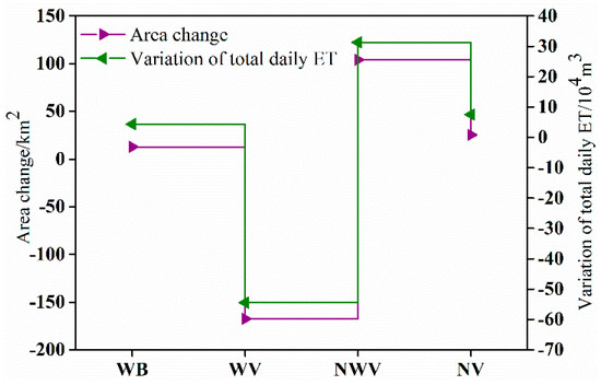 Nevertheless, the influence of land use change on increasing and decreasing ET is well-known, and, in some cases, such an influence is considerably higher than those of climate variations. Therefore, further analysis of the area variation over different landscapes, and changes in total daily ET due to the area variation (Figure 8) was conducted to further understand the influence of land cover on ET. Figure 8 shows that the positive area change degrees of water body, non-wetland vegetation, and non-vegetation during this period decreased in the order of non-wetland vegetation, non-vegetation, and water body, with increments of 103.89, 25.36, and 12.75 km2, respectively. Wetland vegetation area had the largest decrement (167.53 km2) compared with the other three land cove zones. Although the four land cover zones showed some variations in the average ET estimates of per unit area over the years, the differences were insignificant. However, the considerable influence on total daily ET might be attributed to the larger area change. Eliminating the influence of the per unit area average ET of different landscape was necessary. The curve in Figure 9 shows that the total daily ET of the water body, non-wetland vegetation, and non-vegetation increased, with increments of 4.34 × 104, 31.25 × 104, and 7.52 × 104 m3, respectively. However, wetland vegetation had the largest decrement (5.45 × 104 m3), compared with the other three land cover zones. The variation characteristics of the total daily ET showed an agreement with the area change characteristics across the different land cover zones. These findings indicate that wetland vegetation transformation was the main land cover change characteristic, and that the total daily ET varied with the land cover area.