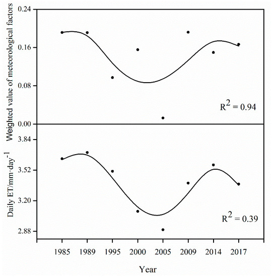 ET varied with temperature, wind speed, relative humidity, and solar radiation. ET was affected by multiple meteorological factors, and these factors might have mutual influences. Thus, the weighted comprehensive analysis method for meteorological factors might be appropriate to identify the relationship between ET and all meteorological variables. The temporal variation trend of ET and the weighted values of meteorological factors is shown in Figure 10. The curves in the graph were polynomial fitting curves of degree 5. A strong correlation was found between ET and the weighted values of meteorological factors, with a correlation coefficient of 0.69, and a similar trend was observed between 1985 and 2017. Therefore, the weighted values of the four climate factors may explain the change in ET. Figure 5 and Figure 8 show that the ET in 2005 had the minimum value in the curve. The change in ET in 2005 was caused by the lowest values of average air temperature, wind speed, and solar radiation, with values of 16.7 °C, 1.7 m/s, and 17.65 MJ·m−1, respectively.