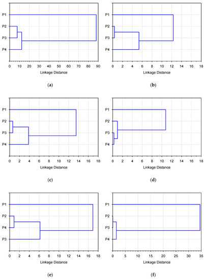 Taking into account all the examined indicators, the similarity of water quality between the locations was less noticeable than in the other analyzed variants, because the whole data aggregation process ended at an intra-cluster distance of 89, and at a distance of 12 two clusters developed (Figure 3a): the first consisting of three points located on the Chechło river (P2–P4) and the second comprising only point P1 located at the mouth of the Młoszówka stream into the water reservoir. This proves that there are large differences in the quality of water flowing in both of the sampled watercourses. In order to analyze the data in detail, a cluster analysis was carried out separately for each group of the examined physicochemical indicators.