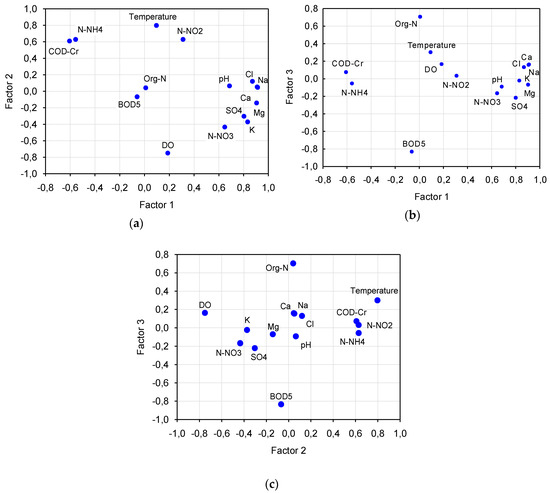 All these parameters represent aerobic conditions or are associated with the conversion of pollutants under aerobic conditions (N–NH4+ and N–NO2−). The opposite position of temperature and DO indicates their inversely proportional relationship. In the case of factor 3 we can observe a large share of Org–N and BOD5 factor loadings (Figure 4a,b). This can be explained by the fact that BOD5 is a parameter specifying the amount of oxygen needed for the decomposition of readily decomposable organic compounds contained in water, which is closely related to the mineralization process. Since organic nitrogen compounds decompose relatively slowly, they generally do not cause an increase in BOD5 in the initial period.