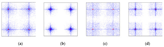 Impact of DIc and DIm on the distribution of offspring in the decision variable space (The red dots indicate the four parents used in SBX and PM. The blue dots denote the ten thousand offspring generated randomly from these parents with specified DIc and DIm); (a) DIc = 1; DIm = 20; (b) DIc = 20; DIm = 20; (c) DIc = 1; DIm = 1; (d) DIc = 20; DIm = 1.