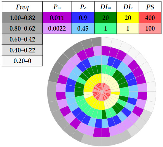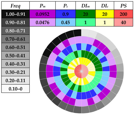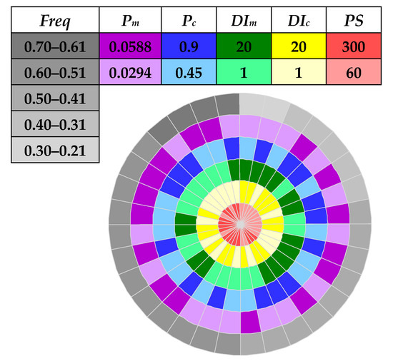 It is evident that different combinations led to dramatically varying performance, as the gray ring covered the whole spectrum of the designated intervals. Surprisingly, the combinations with a PS of 200 accounted for the top half (left) of the gray ring, suggesting that for this benchmark design problems PS was the dominating parameter. With a larger PS, no matter how the other four parameters were set, NSGA-II was able to identify the best-known solutions at a frequency higher than 0.75 out of 100 independent runs consistently. This was already a very high level of robustness and accuracy. Even for the topmost interval (i.e., Freq greater than 0.9), the other four parameters can be arbitrarily combined as long as DIc and DIm were not equal to 20 concurrently. From the right half of the compass plot, it is observed that DIm was probably the second important parameter since a larger DIm always resulted in worse performance. Pc and Pm turned out to have a minor impact on the behavior of NSGA-II. This is somewhat contradictory to what previous studies had concluded, in which Pc and Pm were fine-tuned but DIc and DIm were usually neglected.