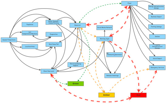 An overall causal loop of flood pathways. Green refers to normal conditions, amber refers to caution for a probability of flooding, and red refers to a very high risk or event of flooding.