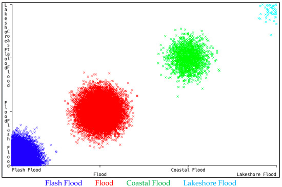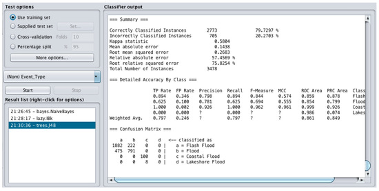 The confusion matrix (Figure 9) shows that the J48 model (Weka) classified 1882 out of 2104 as Flash Flood, 791 out of 1266 as Flood, 100 out of 100 as Coastal Flood and 0 out of 8 instances as Lakeshore Flood correctly. The correctly classified instances in total is 2773 (79.73% rate of success). The MAE is 0.14 and RMSE is 0.27; the J48 technique provides very similar results to Lazy.