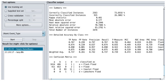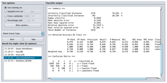 Several models were developed using different ML techniques to be able to measure and compare their performance and accuracy and choose the best. These techniques included Random Forest (RF), Lazy, J48 tree, Artificial Neural Network (ANN), Naïve Bayes (NB), and Logistic Regression (LR). The class for the model in all cases was set as “event type” (Table 1), which included flash floods, coastal floods, lakeshore floods and other kinds of floods. The independent attributes in all models were weather forecast, location, injuries direct, injuries indirect, death direct, death indirect, property damage ($) and crop damage ($) (Table 1). Two of these ML methods used i.e., RF and NB, are tested in both softwares (Weka and Orange) to ensure the accuracy of results.