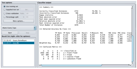 The confusion matrix result (Figure 8) indicates that the Lazy model (Weka) correctly classified 1858 out of 2104 as Flash Flood, 809 out of 1266 as Flood, 99 out of 100 as Coastal Flood and six out of eight instances as Lakeshore Flood. The correctly classified instances in total was 2772 (79.70%). The MAE was 0.13 and RMSE was 0.27. The Lazy technique provides better results than Naïve Bayes.