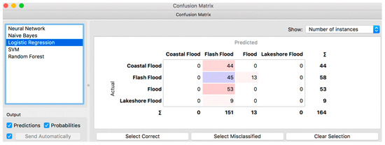 The test data for Orange software consists of 164 instances with target feature of “Event-Type”, of which 44 instances are coastal flood, 58 instances are flash flood, 53 are flood and 9 are lakeshore flood. The test data for Weka software consists of 3478 instances of which 100 are coastal flood, 2104 are flash flood, 1266 are flood and 8 are lakeshore flood. The testing dataset size can vary depending on the user desire and performance of the ML software and hardware capabilities. Four different types of ML techniques in Orange and four techniques in Weka are tested and evaluated in order to be able to choose the best performing technique. The techniques tested are RF, Lazy, J48 tree, ANN, NB, and LR. An overview of the model training and testing process is illustrated in Figure 5, which has been implemented in Orange. First, the training data is passed through different classification techniques (i.e., NN, LR, RF and NB) to build the classification models, then the models are tested using the test data. Finally, the evaluation results are produced and can be analysed and/or visualized (i.e., confusion matrix and scatter plot).