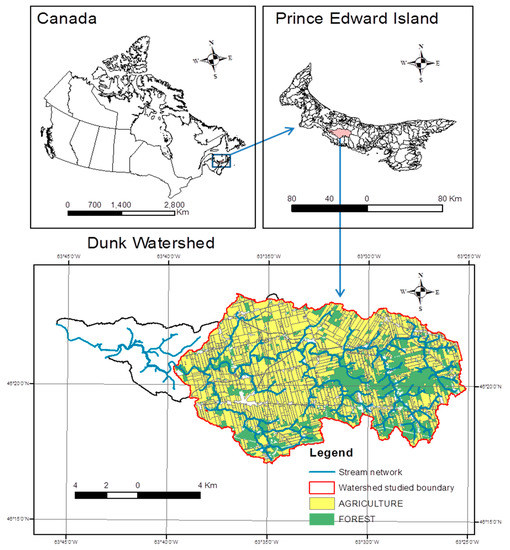 The Dunk River is situated in the central portion of Prince Edward Island (Canada) and flows into the Bedeque Bay that empties into the Northumberland Strait in the Southern Gulf of St. Lawrence (Figure 1). Suspended sediment was measured within the Dunk River at a monitoring station (46°20′5″ N, 63°39′46″ W) with an upstream watershed surface area of 140.6 km2. The studied watershed area is dominated by agriculture (66.1%) while the forest covers an area of 25.1%. The topographic relief is largely of moderately undulating plains with low slopes [1]. The Dunk watershed soils are geologically derived from sedimentary rocks known as redbeds and formed during the Stephanian-late Early Permian period [35]. The two dominant soil types for the study area are the Charlottetown soil series (mainly well drained) and the Albery soil series (moderately drained) occupying, respectively, 74.4% and 17.7% of the total surface area.