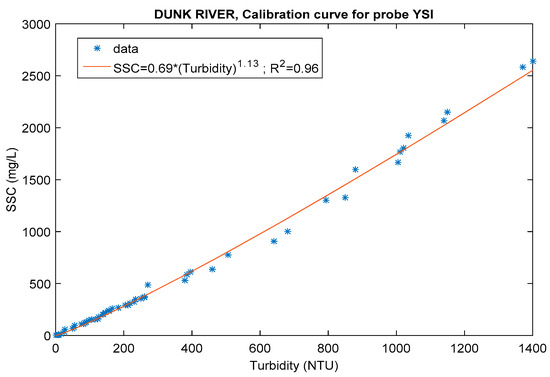 where SSC and Turbidity are expressed in mg L−1 and in NTU, respectively; and are coefficients to be estimated.