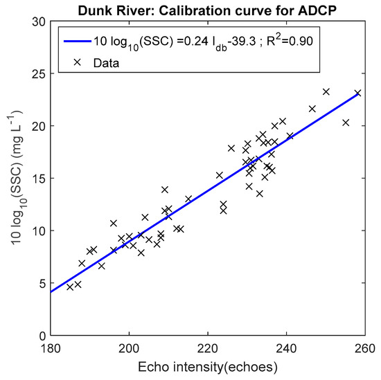 For the OBS, the non-linear relationship between the SSC in mg L−1 as a function of the turbidity in NTU (i.e., the calibration curve) is presented in Figure 2 (NSE and R2 = 0.96 and 0.95, respectively). Figure 3 shows the suspended sediment calibration curve for the ADCP that resulted from the linear regression analysis (R2 = 0.90 with p < 0.001 for 10 log10(SSC) as a function of intensity of echo backscatter).