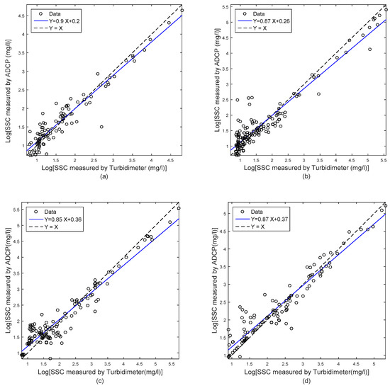 The SSC calculated from data recorded using a sentinel V-ADCP and an YSI 6136 turbidity probe using established calibration curves did not differ from a slope of 1 for the four studied years. Their relative high slopes and low y-intercepts of the best-fit regression lines indicated a good agreement between the two indirect measurement techniques of SSC [47]. However, the acoustic method provided generally lower values than optical method for high sediment concentrations. The difference may be due to a slight bias in the acoustic calibration for high of suspended sediment concentrations. There may also be variations of the particles size distribution for higher vs lower SSC. Moreover, the trend of SSC underestimation at smaller size distribution conditions by the acoustic method is often reported in the literature [7,8,17]. Ultimately, the results of this comparison reveal the potential of the acoustic backscatter technique for a non-intrusive monitoring of SSC within rivers with high sediment loads. Further investigations are needed for accuracy assessment of the outputs of the two measurement approaches by in situ automatic sampling during rainstorms events.