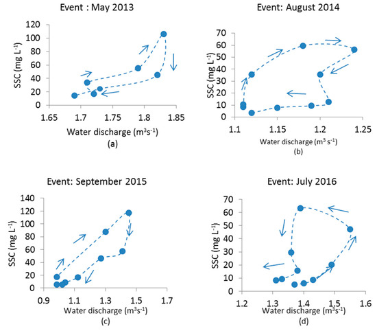 The indices of correlation were moderately weak for precipitation and streamflow and showed that there were neither high significant linear relationships nor high significant monotonic function with the SSC. For high SSC (>25 mg L−1), the indices of correlation were relatively improved for the streamflow and the water velocity. The hysteresis patterns between SSC and water discharge for events with SSC > 25 mg L−1 were analyzed graphically and an example from each year is shown in Figure 5. Over all monitoring campaign periods we collected a total of 27 events of which 20 events (74.1%) show clockwise hysteresis loops, four events (14.8%) had anti-clockwise hysteresis loops and three events (11.1%) were mixed-shaped loops. This result highlighted that the pattern of SSC–discharge relationship for Dunk River is dominated by clockwise hysteresis loops.
