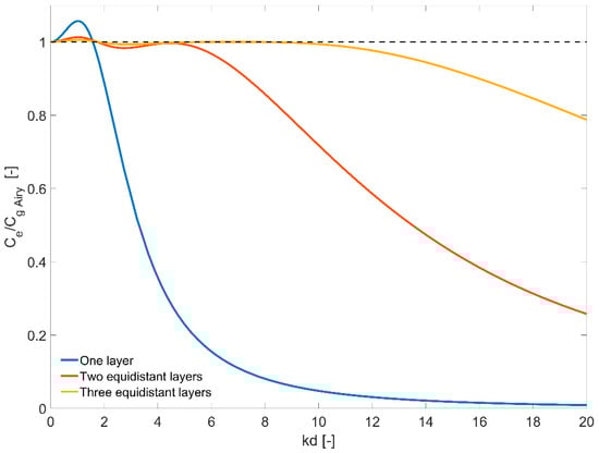 Similarly, the energy velocity (group velocity) can be derived for any number of vertical layers. In Figure 1, the normalised energy velocities for one, two and three vertical layers are plotted as a function of dimensionless depth . In addition, the range of dimensionless depth as a function of number of vertical layers where the relative error in the normalised energy velocities stays below 3% is given in Table 1. It can be observed that by increasing the number of layers, a better fit is achieved with the exact linear solution = 1, fact that makes the model applicable for higher values.