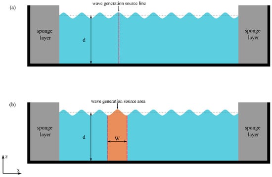 In the spatially distributed source function proposed by Reference [], a spatially distributed mass is added in the continuity equation. Hence, the spatially distributed source function is applied on an area in contrast to the source term addition method which is applied on a line as it is demonstrated in Figure 2. For a single wave component, the source function can be defined as follows