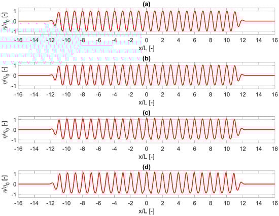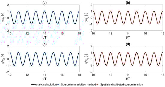 In Figure 3, the normalised water surface elevation calculated using the source term addition method (blue dashed lines) and the spatially distributed source function (red dashed lines) is presented. The computed results at a distance of 1 from the internal generator and at a time period of = 10 to = 18 are compared to the results of the analytical solution (solid black lines) for the same conditions. The agreement is very good while the behavior of the two internal wave generation techniques is similar, with a small deviation for the case of the highly dispersive wave (Figure 3c,d). For the latter case, the spatially distributed source function provides a slightly better fit with the analytical solution.