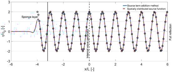 Snapshot of normalised water surface elevation at = 50 using two internal wave generation techniques and the analytical solution (black markers) for the case of deep water linear waves ( = 0.02 m, = 3.0 s, = 10 m, two equidistant layers) with a sponge layer at the left boundary and a fully reflective wall at the right boundary.
