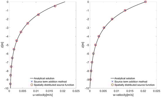 Comparison between computed (markers) and target (solid lines) maximum horizontal and vertical velocity profiles using two internal wave generation techniques for the case of deep water linear waves ( = 0.02 m, = 3.0 s, = 10 m, ten equidistant layers).