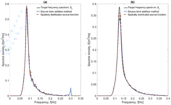 Comparison between the frequency spectra resulting from using two internal wave generation techniques and the target frequency spectrum for irregular waves with = 0.5 m, = 10 m (a) = 12 s (one layer) and (b) = 8 s (two equidistant layers).