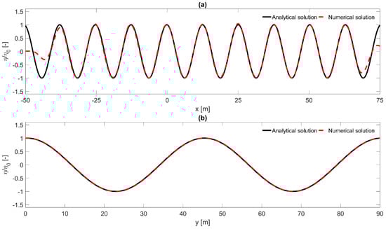 Comparison between computed (dashed line) and target (solid line) normalised water surface elevation at for the case of oblique linear waves ( = 0.01 m, = 4.0 s, = 1.0 m and = 15°): (a) cross section at y = 45 m, (b) cross section at x = 0 m.