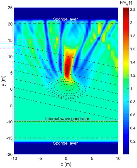 The bathymetry of the experimental setup consist of an elliptic shoal resting on a plane sloping seabed and the entire slope is turned at an angle of 20° with respect to the x-axis. Detailed information on the geometry can be found in Reference []. The numerical basin is 45 m long (−20 < y < 25) and 20 m wide (−10 < x < 10). The internal wave generator is parallel to the x-axis and is positioned at a distance of 10 m (y = −10 m) from the bottom boundary. The remaining numerical domain includes two sidewalls at x = −10 m and x = 10 m and two sponge layers at y = −15 m and y = 20 m with a width of 5 m.