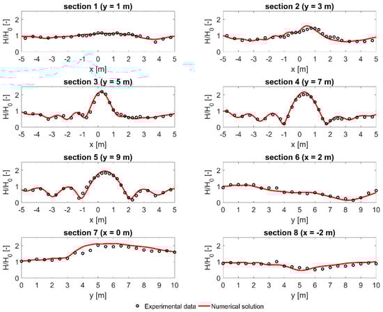 Comparison of normalised wave heights between numerical model results (red solid lines) and experimental data (black circles) along different measurement transects.