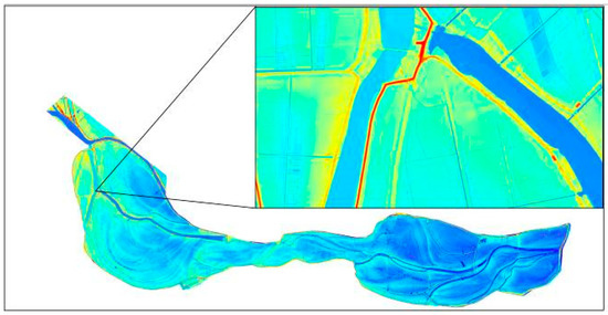High-resolution DEM data was generated by processing the collected airborne LiDAR point cloud (Figure 2 and Figure 3). The DEM data had a spatial resolution of 1 m and the DEM grid contained 22,000 rows × 51,000 columns. The coordinate system was Beijing Geodetic Coordinate System 1954, and the height system was 1985 National Elevation Benchmarks. Seventy control points were selected on field, the error of DEM was 0.04 m. The overall terrain was relatively flat, with elevations ranging from 4.55 to 45.87 m. Many microtopographic features such as dikes, ditches, and fields were captured by the DEM.