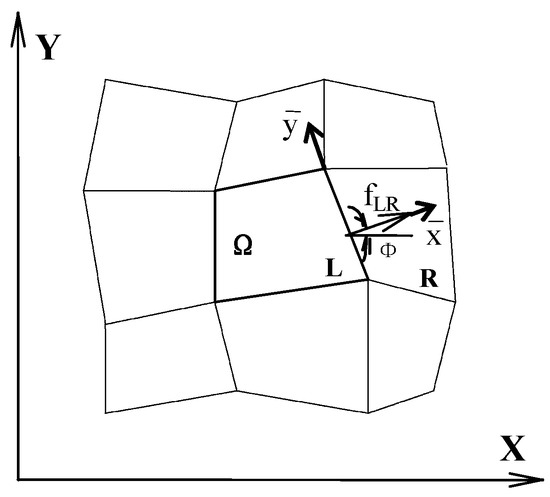 where n is the normal unit vector outside the unit ∂Ω; dω and dL are the area and line integral infinitesimal elements, respectively; and is the normal numerical flux. shows that the solution of normal flux can transform a 2-D problem into a series of local 1-D problems. The finite volume Ω is shown in Figure 6.
