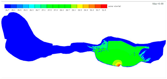 The 2-D hydraulic model mesh was an unstructured triangulation with a total of 83,378 triangular units. Using the 1 m resolution DEM data, nearest-neighbor interpolation was used to obtain the elevation of each triangle apex and center point as the initial condition for model calculation. A flood submerged process of four days and three hours was simulated, and the flood storage and detention area was eventually completely submerged (Figure 7).