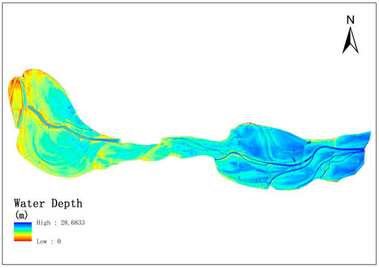 The final completely submerged water depth data (Figure 8) were used for building flood damage calculations. The flooding depth in the eastern part of Gongshuangcha was generally deep, while the west (farther from the inflow sluice) was relatively shallow.