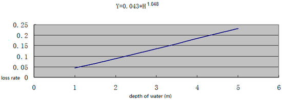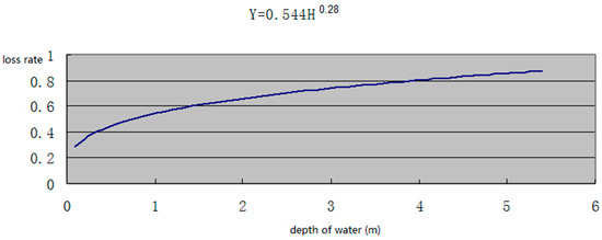 which is , where and are the flood loss rate relations of brick–wood and brick–concrete buildings, respectively. Using these, the relation curves of flood loss rates for brick–wood and brick–concrete buildings are shown in Figure 10 and Figure 11, respectively. Limited by the data collected (Table 2), only loss rate when water depth was no more than 5 m was fitted in the curves. The loss rate when water depth was above 6 m needs to be calculated by extending the curve.