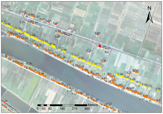 For a single building, the DEM grid inside the building may be completely submerged, partially submerged, or completely unsubmerged. The first and last cases are relatively simple, while a partially submerged situation indicates that the building is located at the boundary of the flood water. In this case, it is more appropriate to consider this as submerged. Thus, the submerged depth of the building can be obtained by Hwater level = Max(Hcell1 + Hcell2 + …… + Hcelln)/n, where n is the number of DEM cells inside the building and Hcelln is the water depth of the nth cell inside the building. Using this approach, the flood statistics for brick–concrete and brick–wood buildings at different water depths are shown in Table 3 and an example map is given in Figure 12.
