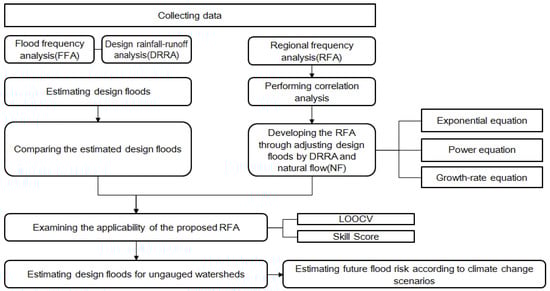 Recently, future flood risks are being studied using various climate change scenarios [18,19,20,21,22]. Because climate change is likely to affect the water cycle by influencing the precipitation patterns [23], it is important to integrate the anticipated changes into the design flood in response to the increasing flood risk. Various technologies for disaster prediction, preparation, and prevention are needed to cope with future flood disasters, and it is necessary to calculate accurate future hydrological quantities to ensure the stability of hydraulic structures. We need to develop a method to estimate the design floods for preparing a comprehensive flood mitigation plan considering climate change, especially for the ungauged watershed.