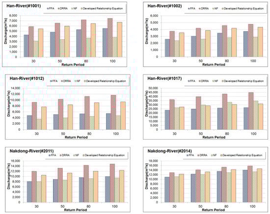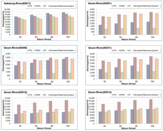 Figure 2 shows the flow chart of this study. The design floods estimated by three methods, i.e., Qt,FFA, Qt,DRRA, and Qt,NF (t = 30, 50, 80, and 100 years), are shown in Figure 3. In the Han River basin, the design flood of FFA was estimated to be 8.51%~58.43% (average 27.71%) smaller than the DRRA. In the Nakdong River basin, the FFA was estimated to be 5.78%~26.32% (average 15.10%) smaller than the DRRA. In the Geum River basin, the errors were ranged from 6.26% to 67.55% (average 33.10%).