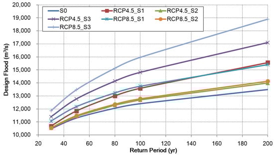 Quintero et al. [37] found that by the end of the current century, the 100-y flood could increase by 47% to 52% in the catchments of the Cedar River and by 25% to 34% in the catchments of the South Skunk River in Iowa. Kim et al. [38] used the same periods (S1, S2, S3) classified in this study and found that the 50-y floods to increase by 10% to 22%, the 100-y floods by 10% to 24%, and the 200-y floods by 30% to 43% for the Miho river basin, Korea. This means that future climate change may increase the risk of extreme floods.