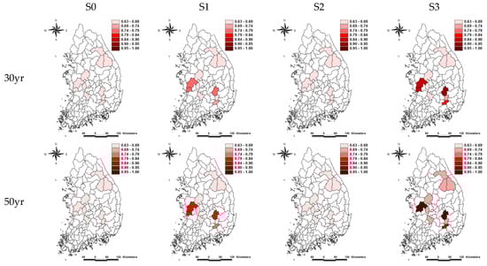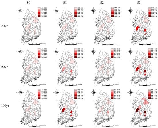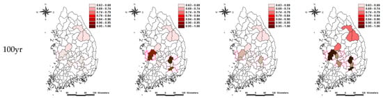 The flood risk was evaluated to be smaller in the S1 period than in the S2 as a whole. The reason is two-fold: the hydrological flood risk was assessed to be small because the natural flow of the climate change scenario in S2 was smaller than S0. Except for #1017 basin, the flood risk increased from the present to the future, and the risk increased by 0.193 on average compared to S0 and S3 at a 100-y return period in the RCP 8.5 scenario. In the RCP 4.5 scenario, the flood risk was 0.156. The accuracy was likely to decline when the ratio between the maximum annual average of natural flow and the average watershed width was 500 or more (as in the case of #2017), but the accuracy was high in watersheds with small watershed areas. Figure 5 and Figure 6 show how the flood risk of each watershed changes from the present (S0) to the future (30 years, 50 years, 100 years) according to climate change scenarios.
