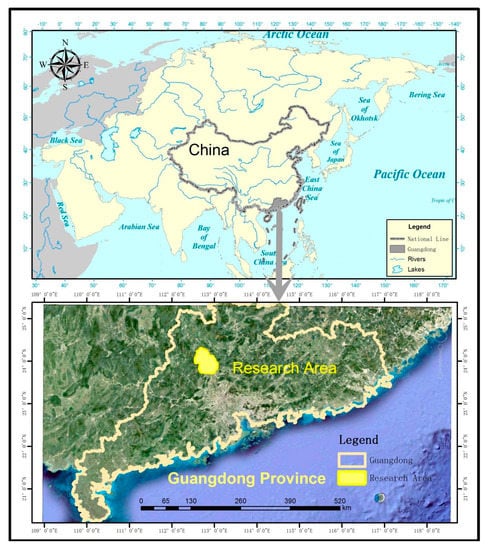 The location of the research area. The upper half is the location of China, the lower half shows the contours of Guangdong Province, and yellow area in the middle depicts the research area.