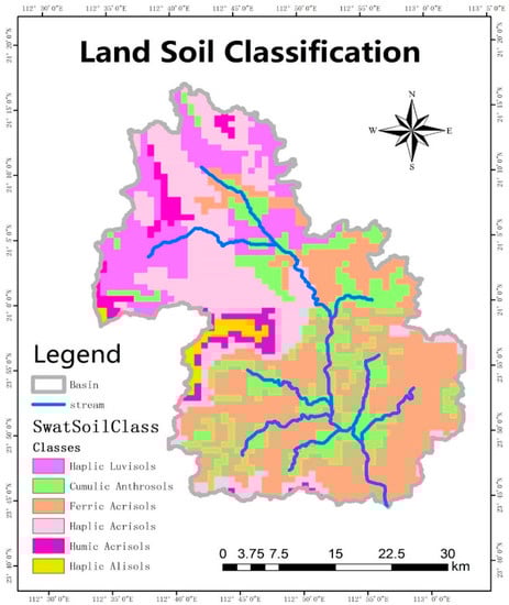 Thirdly, the soil classification and soil properties were extracted from the 1:500,000 scale FAO-UNESCO (Food and Agriculture Organization of the United Nations) Digital Soil Map of the new comprehensive Harmonized World Soil Database, as shown in Figure 2. Most of the soil properties that were obtained refer to “Guangdong soil” [] and Soil Science, Chinese Academy of Science []. Additionally, daily weather data from six stations in the watershed from 2005 to 2014 were obtained from the China Meteorological Science Data Sharing Service Network [], which is shown in Figure 3.