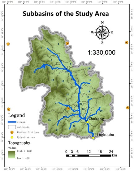 To simulate runoff in a watershed with a river network, we should first delineate its sub-basins. The model obtains the flow direction of each grid by the maximum gradient method, with the D8 algorithm, on the DEM, and then counts the number of flows through the grid to estimate the cumulative flow []. Through the process of water delineation, the study area is divided into 31 sub-basins, which are shown in Figure 3.